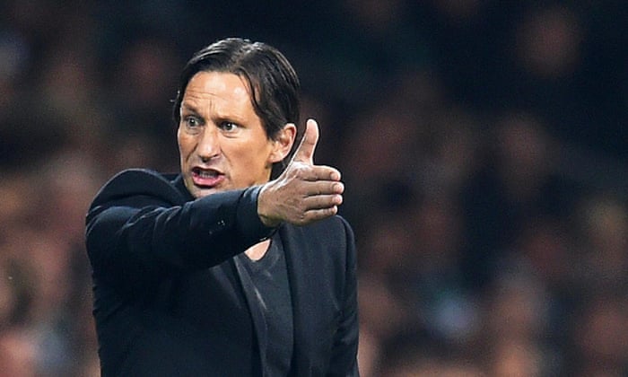 Sin embargo, aunque ese hobby pudo haber comenzado como entrenador a la edad de 37 años en Delbrücker SC, rápidamente se convirtió en un completo papel de entrenador en Preussen Münster, Paderborn y luego Red Bull Salzburg. En ocho años, Schmidt pasó de ser entrenador de jugadores a tiempo parcial al líder de tiemp o completo de un equipo que esperaba ganar la Bundesliga austríaca.Facebook Twitter Pinterest Roger Schmidt habla con su escuadrón durante el entrenamiento el lunes. Fotografía: Martin Meissner / AP